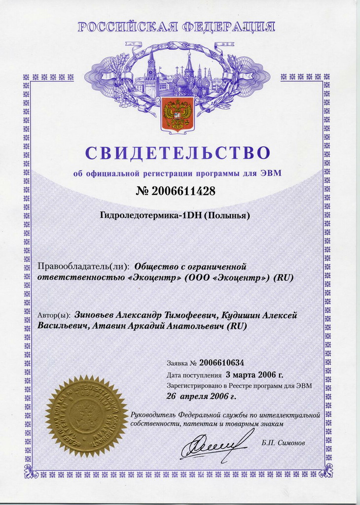 Сертификат на ПО Гидроледотермика -1DH (Полынья)